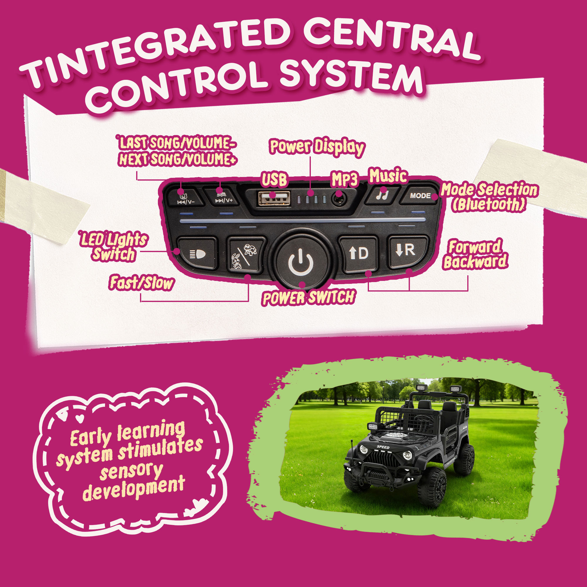 - Built-in Music & Adjustable Volume:Our ride-on car features built-in music with adjustable volume control, providing endless entertainment for your little explorer. The premium sound system delivers crisp audio quality, playing nursery rhymes, fun melodies, and educational songs. Parents can easily adjust the volume to a comfortable level, ensuring safe listening for young ears. This engaging feature keeps children happily occupied during rides while stimulating their musical development. The i