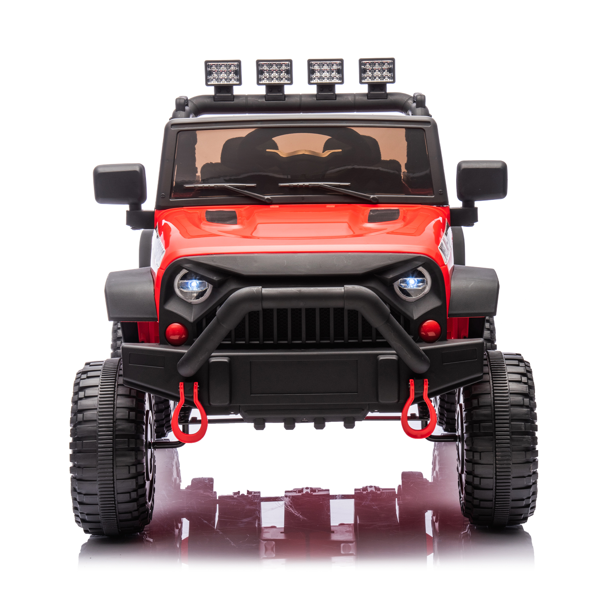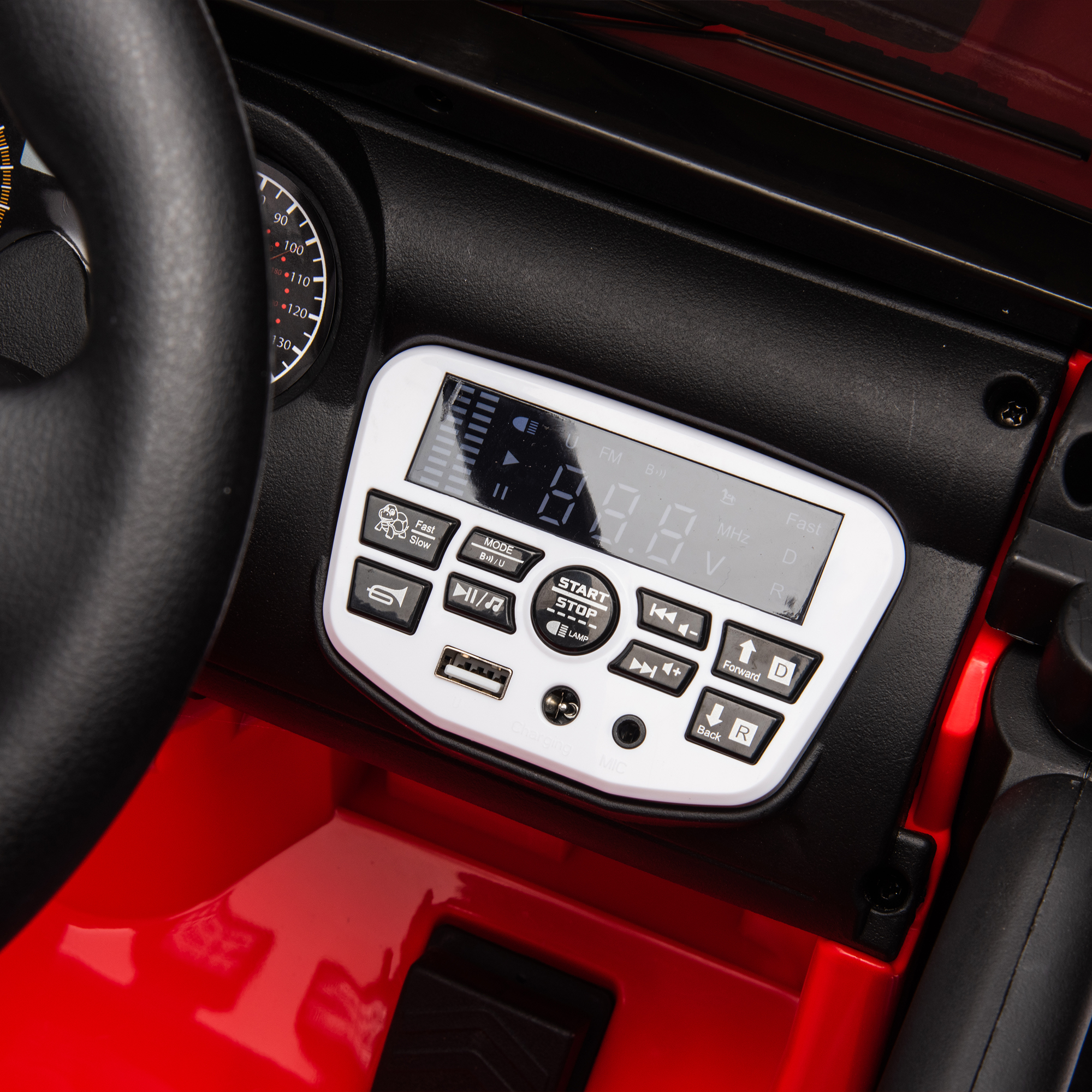 Front Lights: With front light function, it not only increases the safety of night driving but also brings more exploration fun for children. They can play more safely outdoors at night. Parents can control the stroller's lights as needed, improving visibility and saving power to extend the stroller's usage time. Battery Display: Intuitively displays the stroller's battery level, allowing parents to understand the stroller's battery status in time and avoid the embarrassment of suddenly running out of power. Double Doors Opening: The stroller is equipped with a double door design, which not only facilitates children getting on and off the stroller but also enhances safety, protecting children from being pinched when the doors are closed. 2.4G Remote Control: Through the 2.4G remote control, parents can easily remotely control the stroller, even when a certain distance away, greatly improving convenience of use. Four-Wheel Suspension: Equipped with a four-wheel suspension system, it provides a more comfortable riding experience for children regardless of rugged terrain or uneven roads, protecting children's physical health. Handle for Easy Carrying: Easy carrying of the stroller becomes possible, allowing parents to fold or lift the stroller easily for carrying and storage. Safety Belt: The design of safety belts ensures the safety of children in the stroller, providing parents with peace of mind whether during the journey or when parked. Features FUNCTION: One key start Forward and backward High and low speed High central control (with USB, MP3, music, Bluetooth, large display, horn) Front light, light control switch Power display Double door 2.4G remote control Four wheel shock suspension Handle Seat belt Providing 4-6km/h(approximately 2.49 to 3.73 mph) speed for kids over three years
