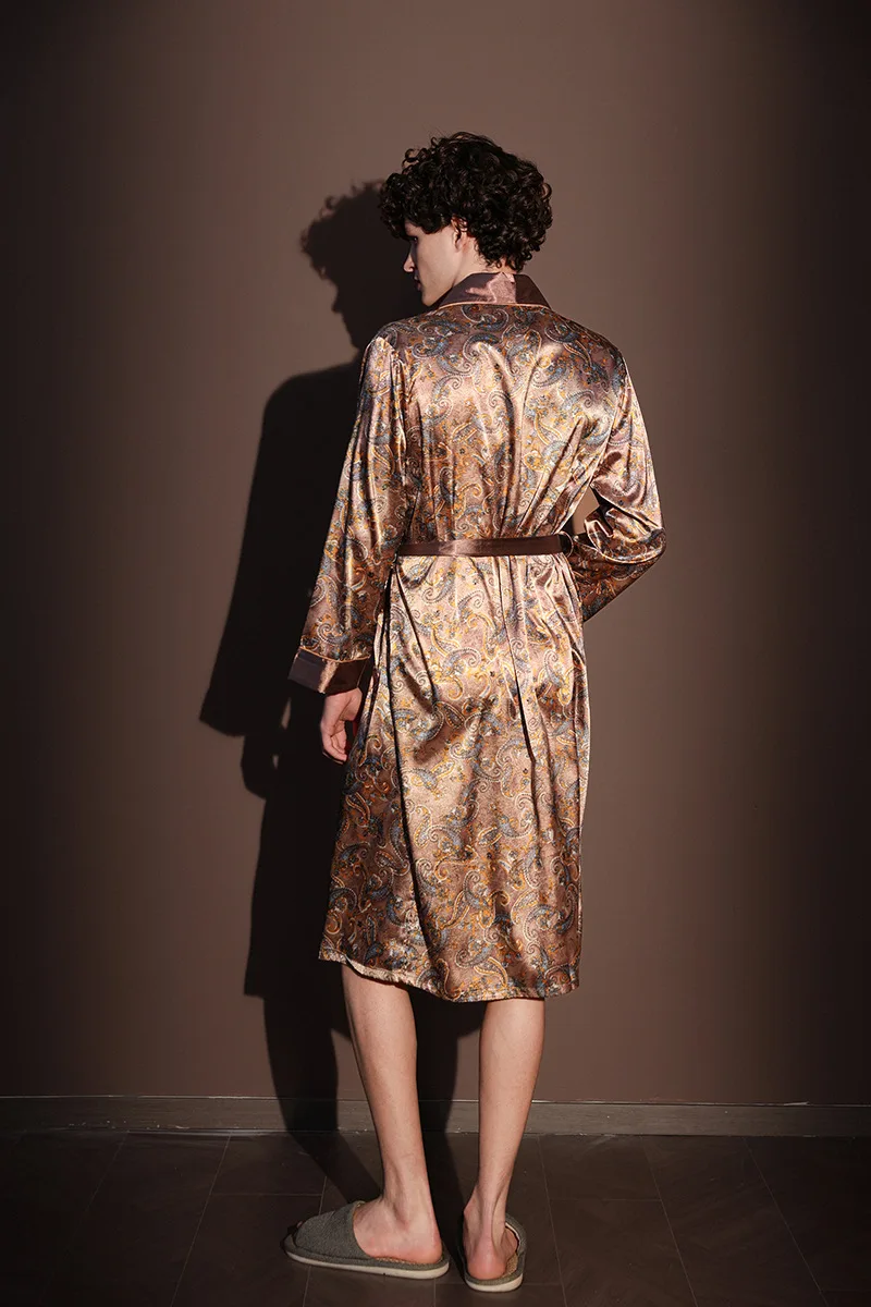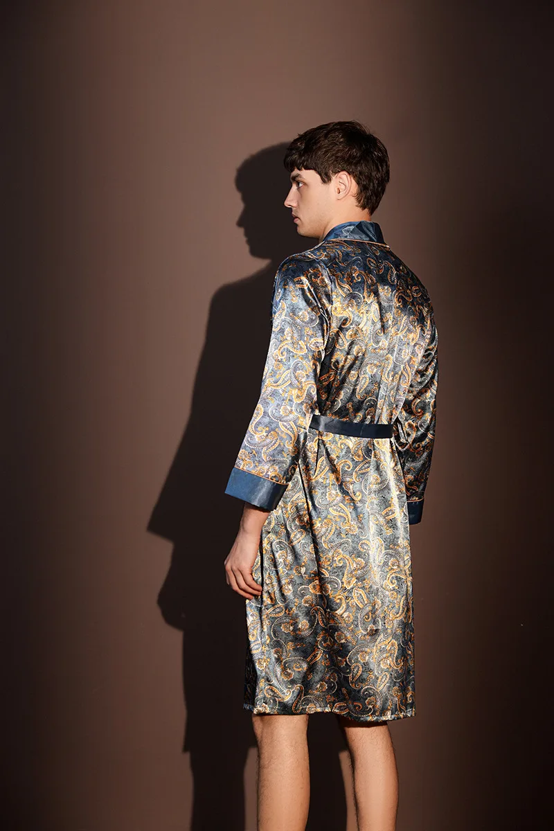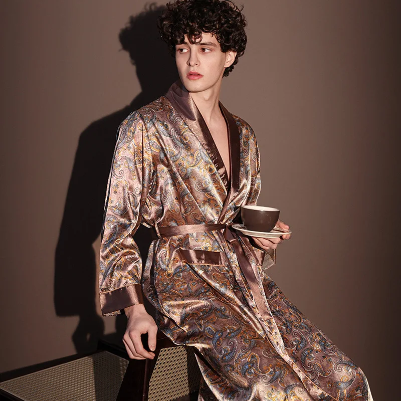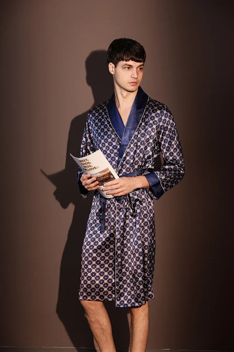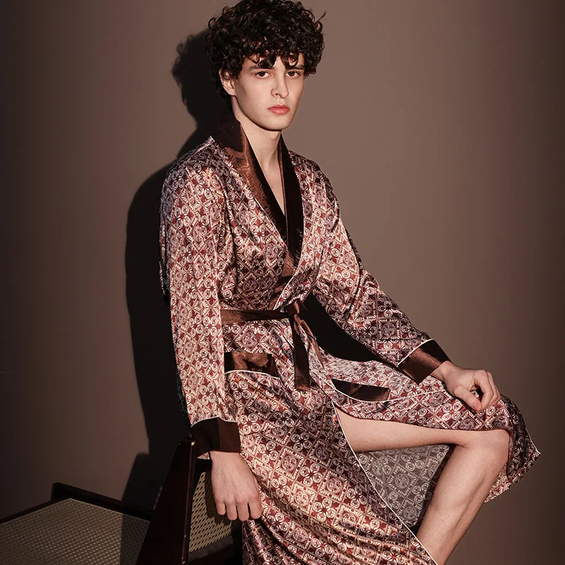 Men's Thin Bathrobe High Quality Nightrobes One-Piece Robe Male Loungewear Gents Spring and Autumn New Ice Silk Printed Pajamas