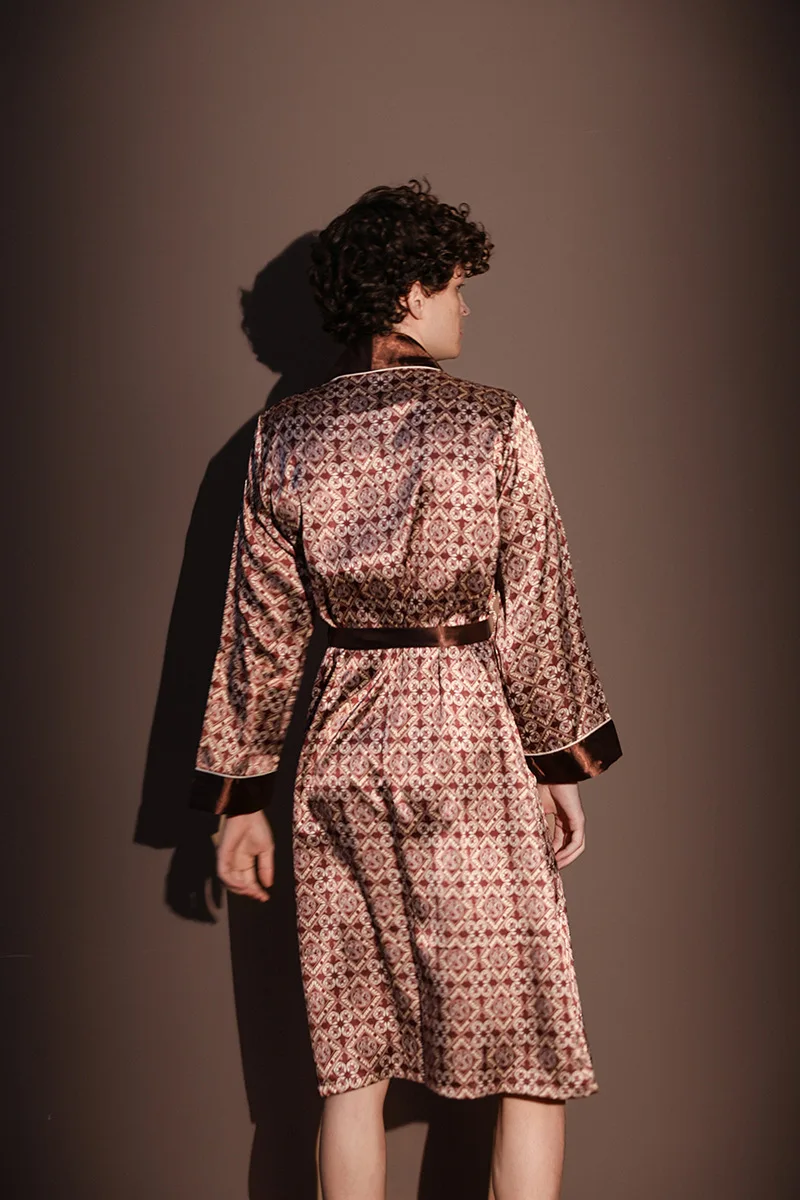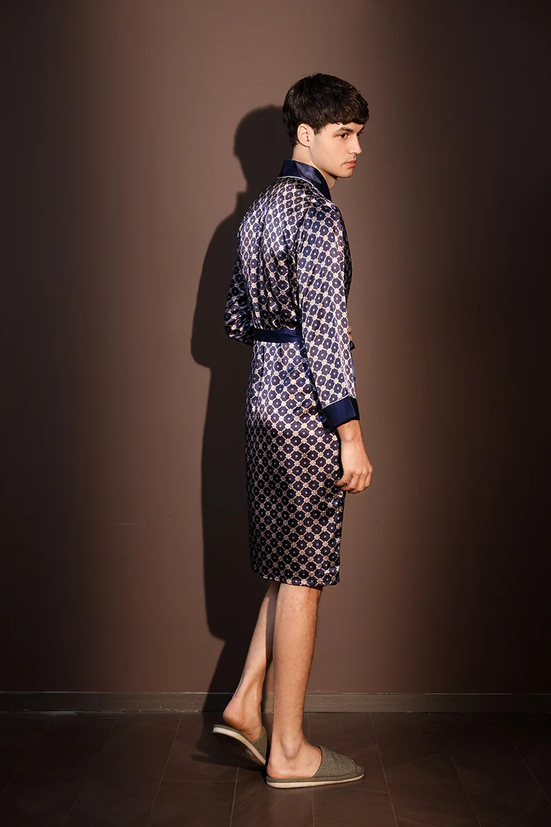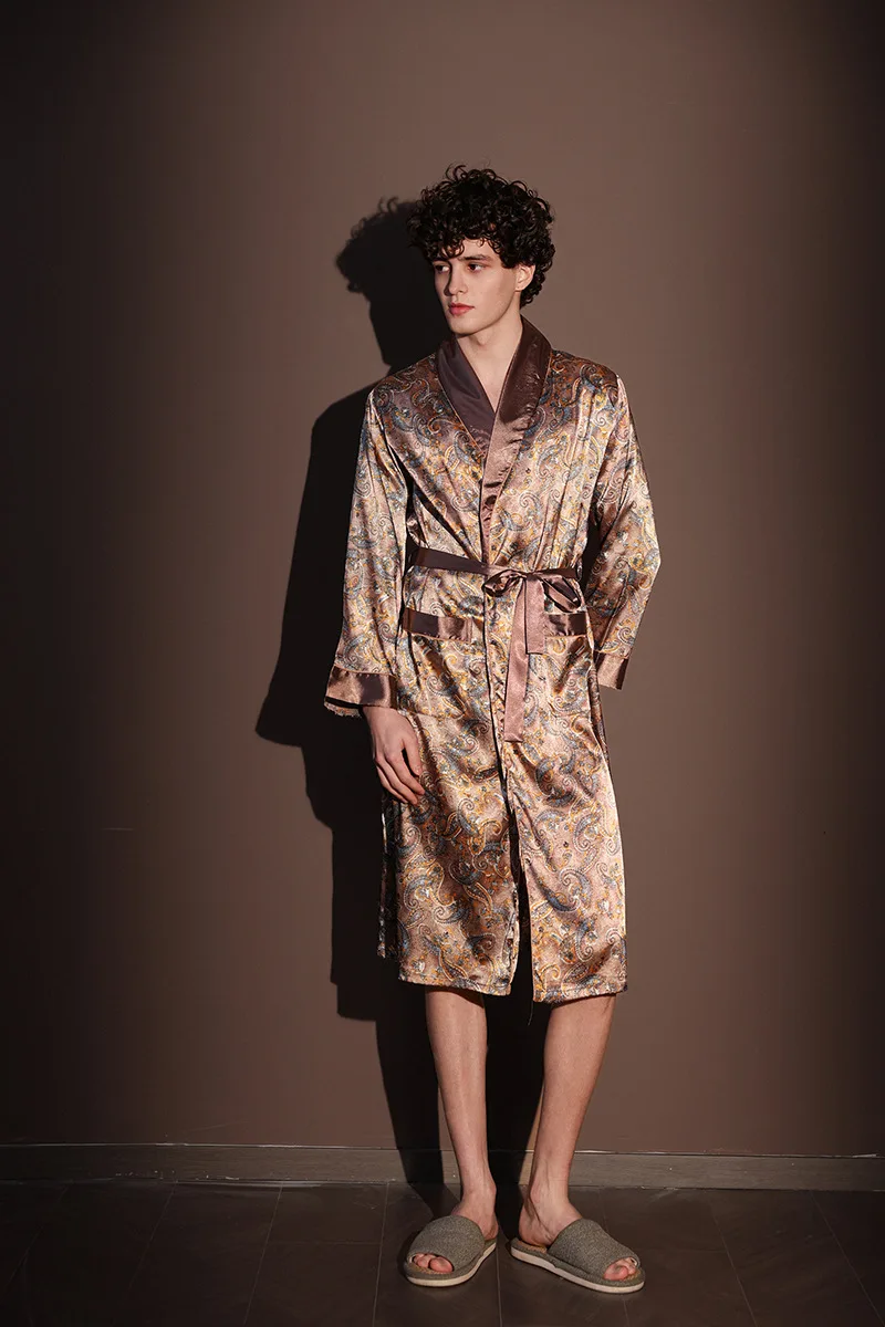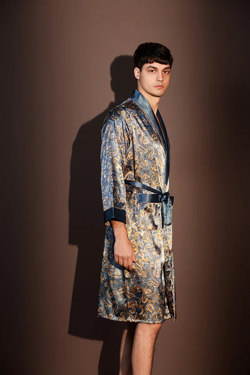 Men's Thin Bathrobe High Quality Nightrobes One-Piece Robe Male Loungewear Gents Spring and Autumn New Ice Silk Printed Pajamas